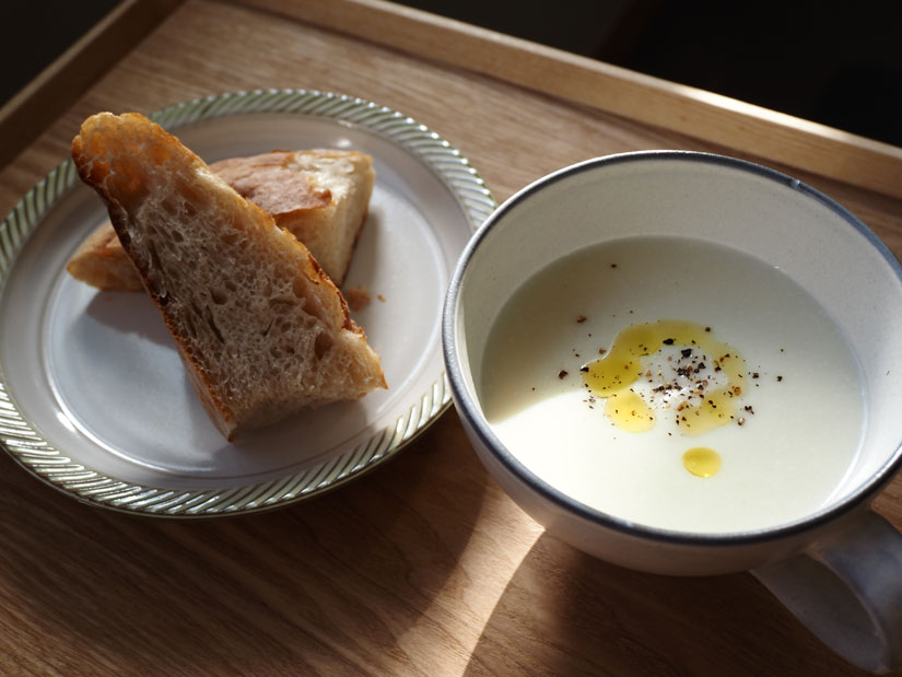 季節の野菜と自家製塩麹で作るやさしい味のポタージュスープに「elnice(エルニス)」のパンがセットになった「パン&ポタージュスープセット」も提供。このポタージュスープは380円でテイクアウトも可能。
