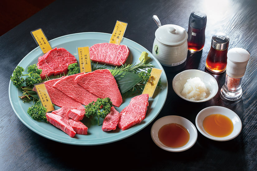 その日に仕入れた信州牛の最高部位を盛り合わせにして提供。この日はリブ巻、はねした、カイノミなど。おろしポン酢、わさび、岩塩、つけダレなどをお好みで。厳選部位を食べ比べる贅沢セットじゅわ~っと口の中でとろけてなくなる至福の時間を堪能して。