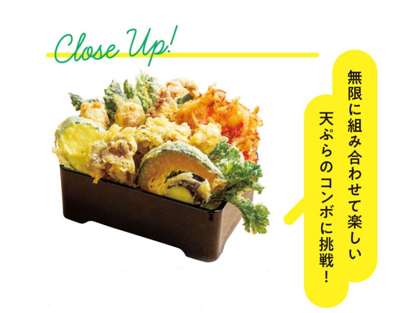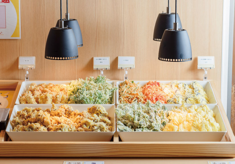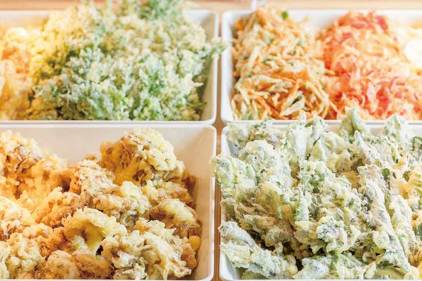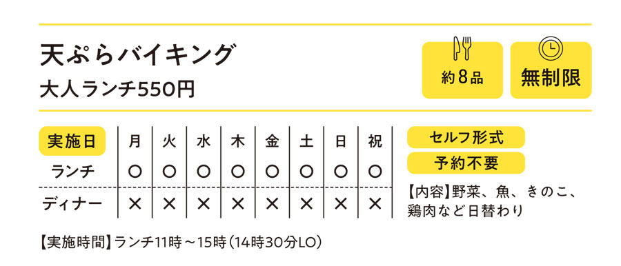 人気のランチタイム限定の天ぷらバイキングでは、専用カウンターに常時8種類が登場。夏季なら松本の自社農園で育てた新鮮野菜を使った天ぷらなどが味わえます。天つゆ・抹茶・わさび・カレーなど6種類の天ぷら塩が用意されるため、さまざまな組み合わせで天ぷらを食べ比べすることも可能。ごはんと天ぷらバイキングを一緒に注文すれば、「無限天丼」が完成!