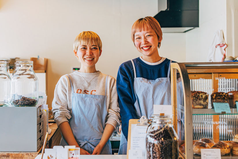 「店名通り“人と人の居る場所”をつくりたくてカフェをオープンしました」と店主の夏生さん。右はスタッフの桃子さん。果樹園で働いていた経験を持つ夏生さんは、生産者目線で素材を選ぶことも。東御市産のナガノパープルや長野市の「ぴっころ彩園」の野菜など、つながりのある生産者から直接素材を仕入れることも多いそう。
