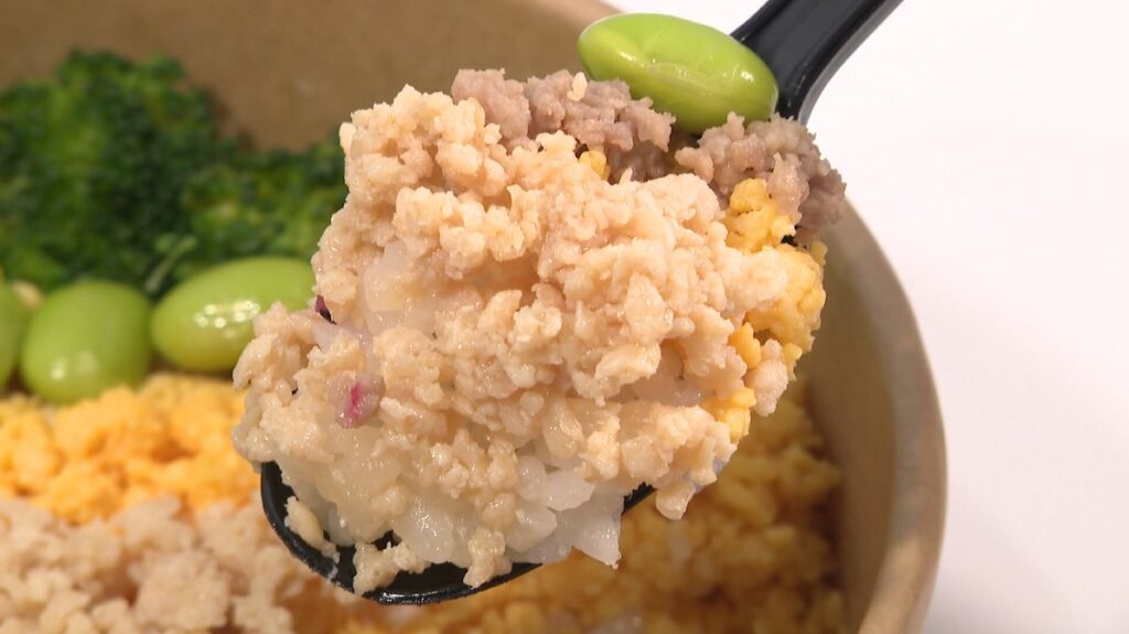 味付けはシンプルで昔懐かしい感じ。鶏そぼろの旨味、枝豆のコリコリ感、卵のふんわり感と、食べ進めるのが楽しくなるお弁当です。