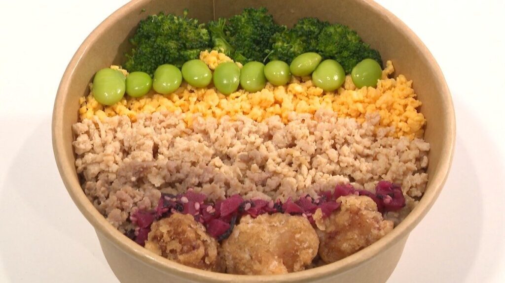 数あるお弁当の中で特におすすめなのが「レインボー弁当」。ご飯の上に7種類のおかずを並べていています。具材はブロッコリー、枝豆、卵そぼろ、鶏肉のそぼろ、唐揚げ、梅と色とりどり。