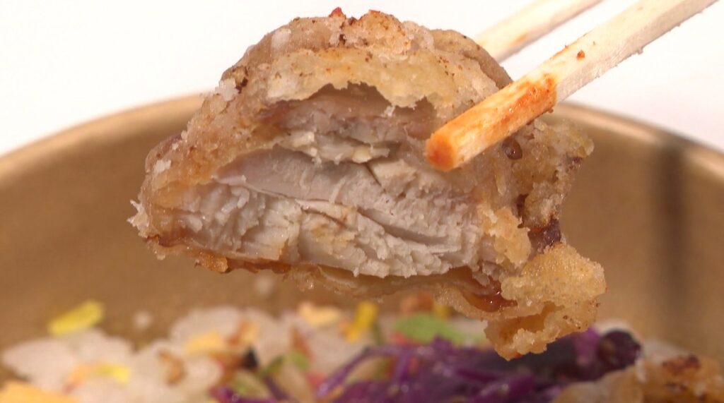 おすすめのお弁当は他にも。こちらは松本らしい「山賊焼き弁当」。山賊焼きは口に運ぶと、肉の旨味、にんにくのパンチのある香りが広がります。目玉の付いたかわいらしいタコさんウィンナーも。お子さんも喜びそう。