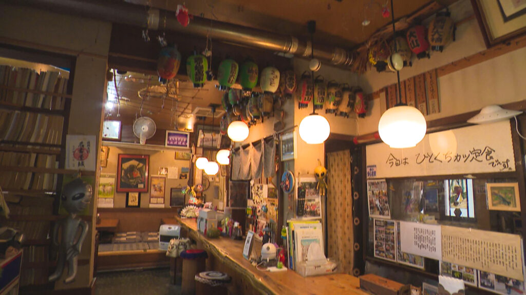 店内を見渡すと目に留まるのが宇宙人やUFOのグッズの数々。店主は大の宇宙好き♡子どもの頃に望遠鏡で月を見て感動したのがきっかけだとか。近所の銀行がチラシ用に撮影した写真にUFOが写り込んでいた逸話がお店の世界観を盛り上げます👽