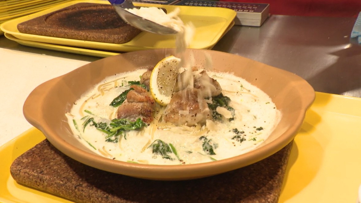 注文したのは人気の「レモン香るペッパーチキンのパルメナーラ」。席に持ってきてもグツグツと音を立てています。一口食べてみると、自家製の生パスタはモチモチ。クリームソースとよく合います。さらに黄身を割って混ぜると濃厚な味わいに。