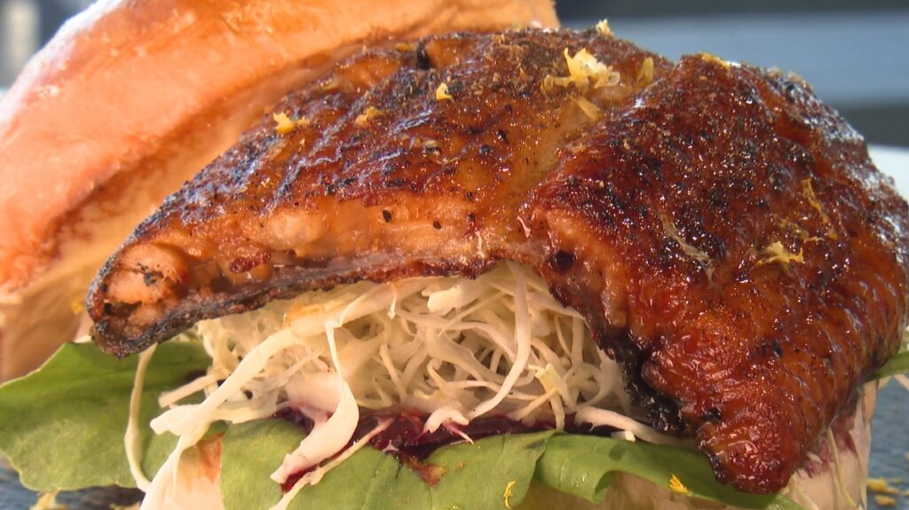 名店として知られる地元・岡谷市の「やなのうなぎ 観光荘」が手掛ける「シルクうなぎ」のかば焼きとタレを使用。かば焼き、ルッコラやローストビーツなどの野菜を挟むのは、諏訪市の老舗パン店「太養パン」のバンズ。2つの名店とのコラボメニューです。パリッ、ふわっとしたバンズ、厚みのあるかば焼き、タレのかかった野菜がみごとにマッチ。ボリュームがあるので、人目を気にせず、大きな口でダイナミックにいただきましょう!