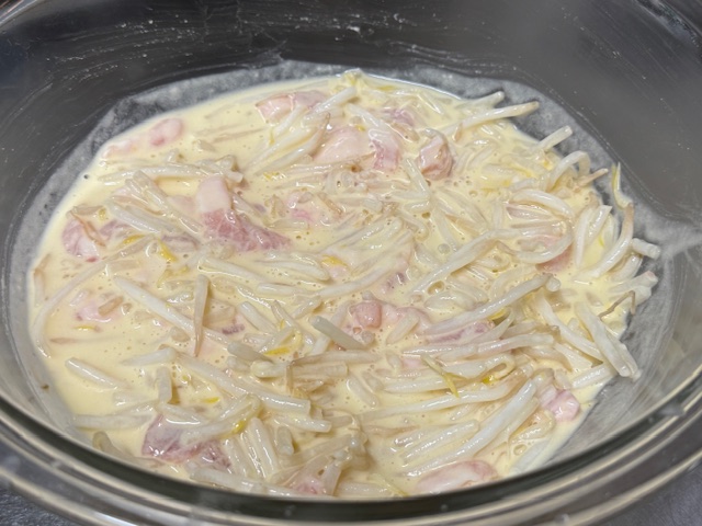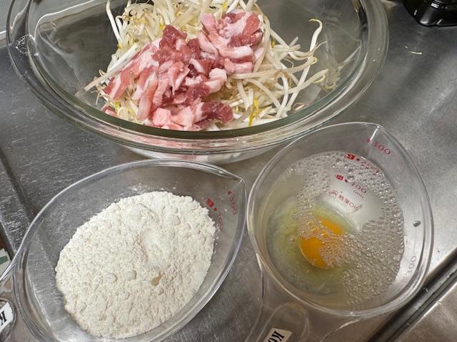 1. 豚薄切り肉は1cm幅に切り、もやし、すいとん粉、卵、水と混ぜ合わせ、塩・こしょうする