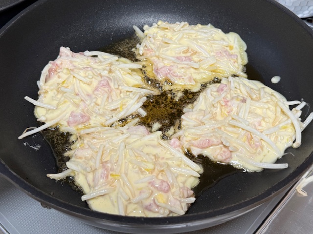 2.フライパンに油(大さじ1)を熱し、1の半量を円形にして4個入れたら、ふたをして両面焼く。