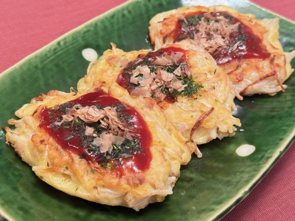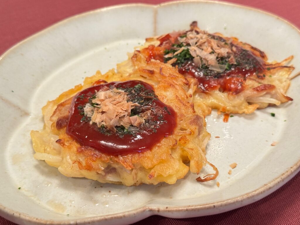 外は香ばしく、中はもちっとジューシー。すいとん粉を使った新感覚のお好み焼き風レシピとして、日々のごはんやおつまみに大活躍する一品です。