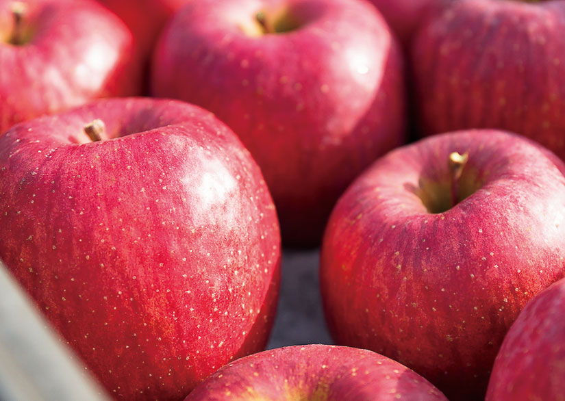 「サンふじ」は袋をかけずに日光をたっぷり浴びて育つ無袋栽培。完熟すると蜜が入りやすいのが特長です。