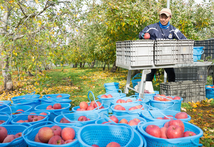 「ふじ」は果実が小さいうちに、一つひとつ袋をかける有袋栽培。収穫直前に袋をとり集中的に日光に当てることで、贈答用にぴったりの目にも美しいりんごに仕上がります。