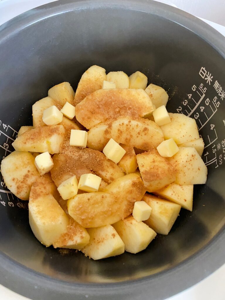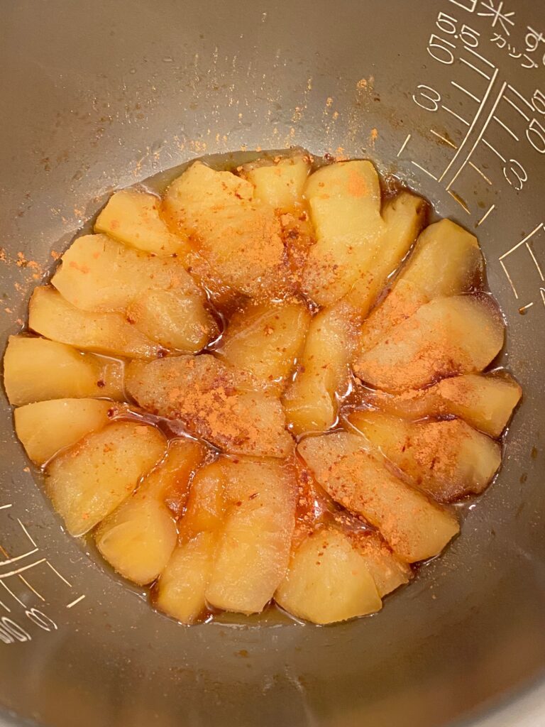 ①炊飯器に分量のリンゴ、砂糖、バター、レモン汁、シナモン(お好みで適量)を入れて、炊飯する。炊飯が終了したら、煮リンゴの完成。
