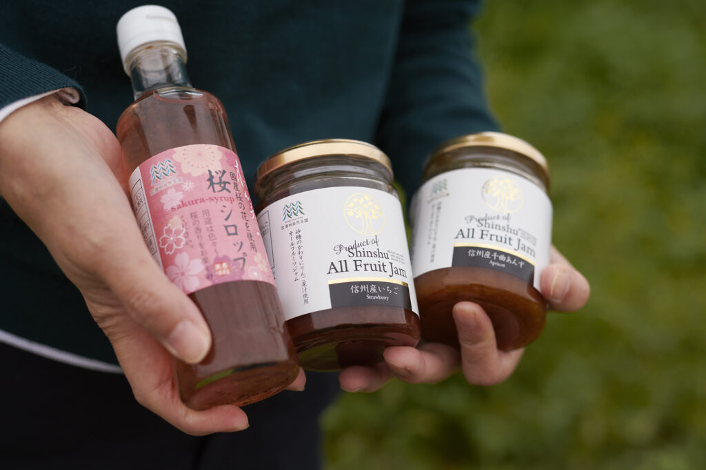 『信州オールフルーツジャム』には、イチゴのほか、リンゴ(紅玉)、プルーン、モモ、アンズ、ラ・フランスなど多彩なラインアップをそろえています。
