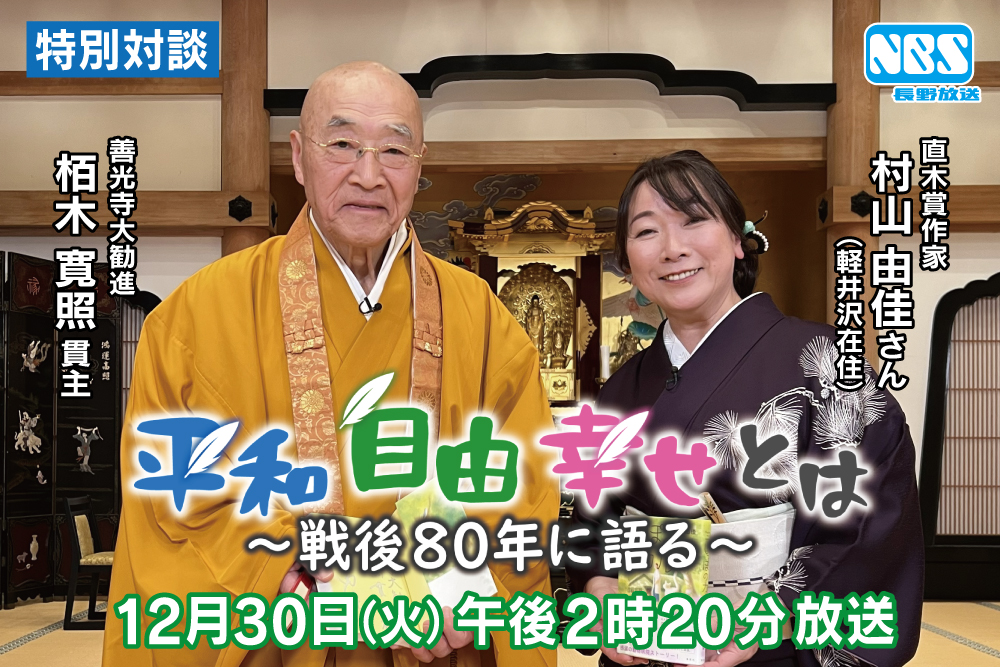「戦後80年」の2025年が暮れようとしています。現在の日本は平和ですが、世界に目を転じれば戦争や紛争が絶えない状況です。またSNSなどでは過激な言葉が生まれ、「分断」や「生きづらさ」すら感じる時代に・・・。節目の年の最後に、善光寺大勧進の栢木寛照貫主と、直木賞作家で軽井沢町在住の村山由佳さんが「平和・自由・幸せ」について語り合いました。
