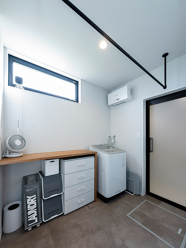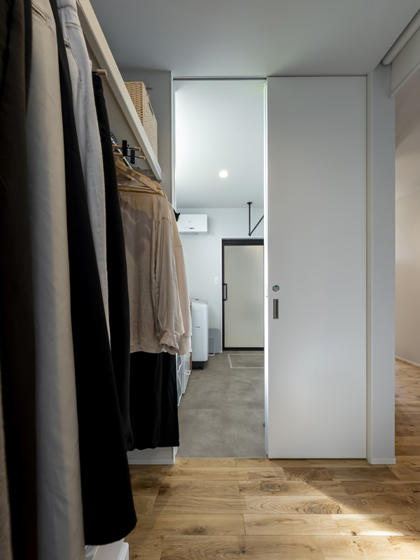 脱衣室はランドリーを兼ね、ここで洗濯を完結できるようにされています。隣にはファミリークロークが続き、その先には玄関クロークも。身支度・帰宅後動線がすっきりしています。