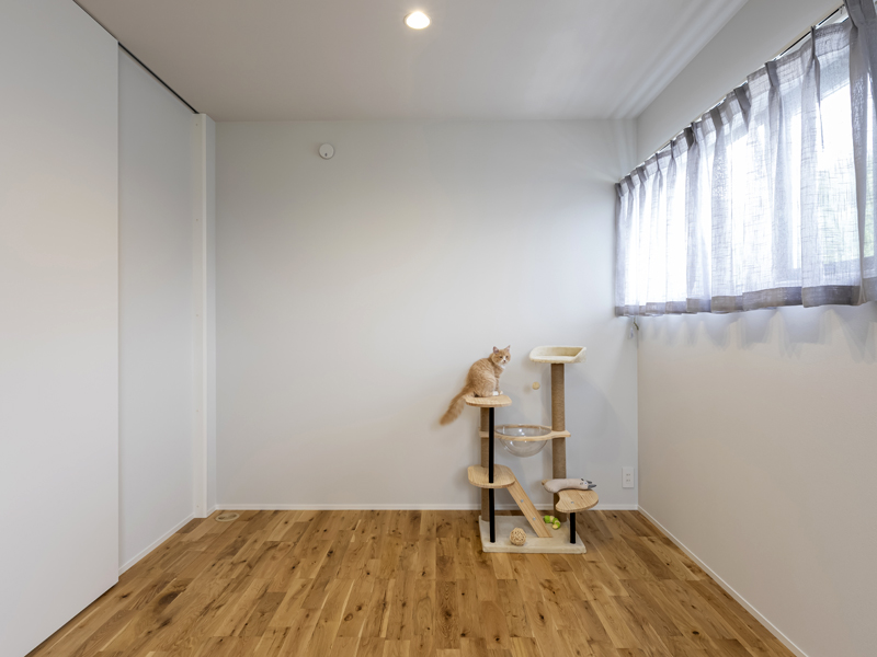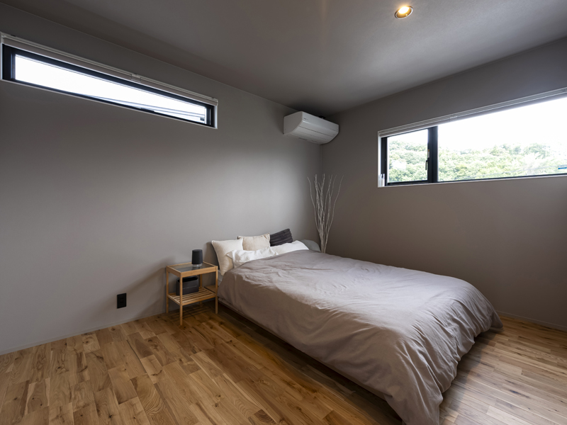 2Fには寝室と子ども部屋。寝室はグレージュにまとめらてて、勾配天井と大きめの採光窓でゆったりしたスペースです。収納も広めに作られています。子ども部屋は2間に分けられるように作ってあり、将来の家庭環境の変化にも対応できるよう設計されています。