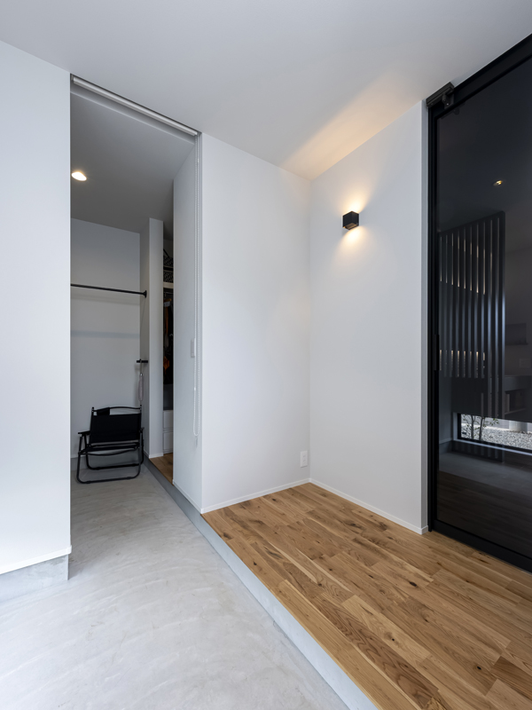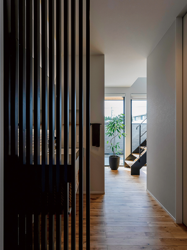 玄関を入ると、真正面にテラスに面した窓が見えます。空まで視線が抜けて、気持ちがいい。「帰宅して、最初に目に入る景色にほっとする」と奥さま。