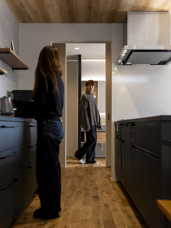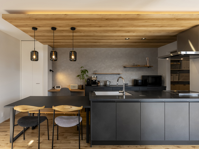 キッチンとダイニングは横並び。背面のカウンター収納との間にゆとりがあって、複数でも作業しやすそうです。キッチン右側はパントリーに続きます。