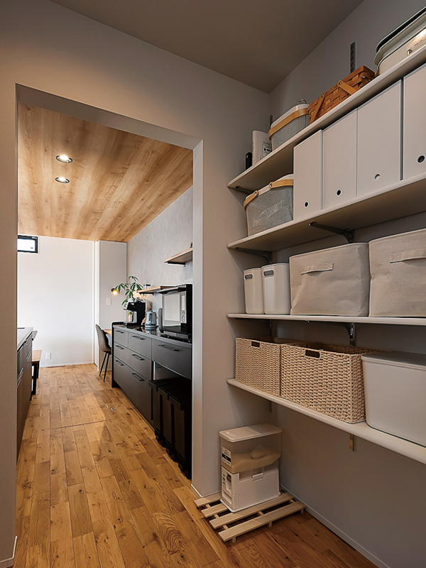 玄関ホールに入るとすぐにパントリーへ入れます。冷蔵庫も格納されていて、買い物後の動線がとてもスムーズです。