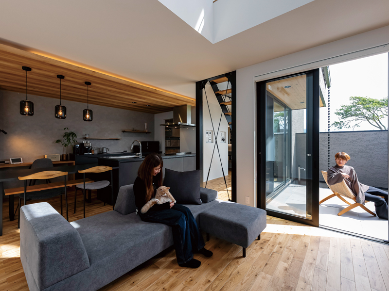 LDKは、プライバシーの保たれた中庭とつながる開放的な空間。リビングの南には敢えて窓を設けず、東面を大きく開放。吹き抜けと中庭から彩光を得られるようにしました。カーテンを閉めることなく、オープンに過ごせます。