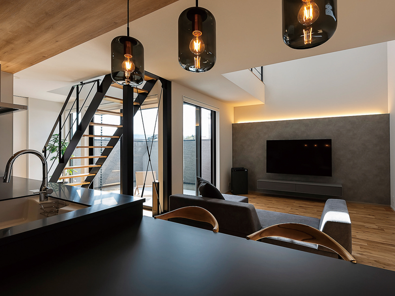 「キッチンにいても、家族と同じものを視て会話を共有したい」と、キッチンはテレビ正面に配置。中庭が望め、家じゅうの様子も把握できるベストポジションになりました。