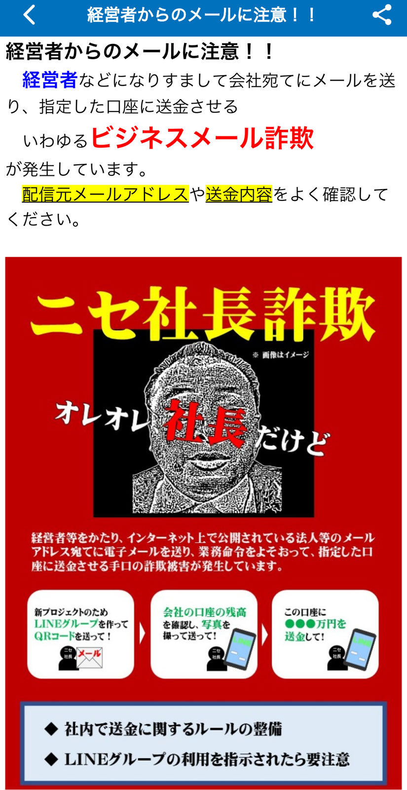 最近では、経営者になりすまして、会社宛てにメールを送り、指定した口座に送金させる、いわゆるビジネスメール詐欺が多く発生していますが、そういった情報もいち早く「お知らせ機能」で知ることができます。