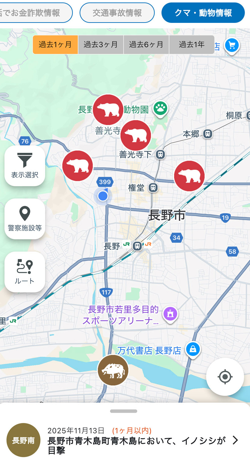 マップ上では、例えば「2025年11月13日、長野市青木島町青木島において、イノシシが目撃」といった具体的な情報が確認できます。出没情報だけでなく、「イノシシに遭遇したときは、決して近づかず、刺激することなく、ゆっくり後ずさりしてその場から離れます」といった注意事項も表示されます。