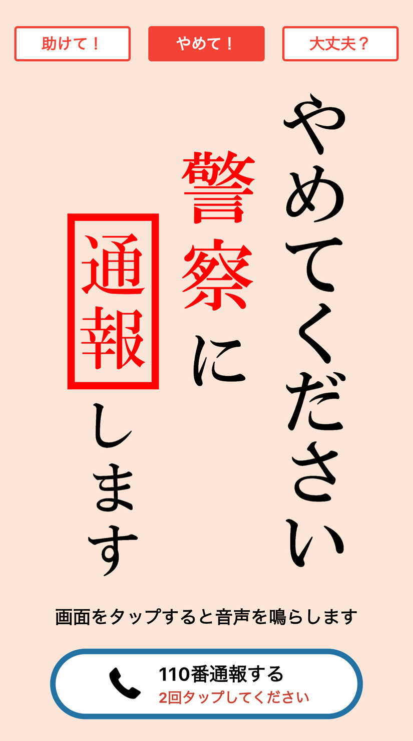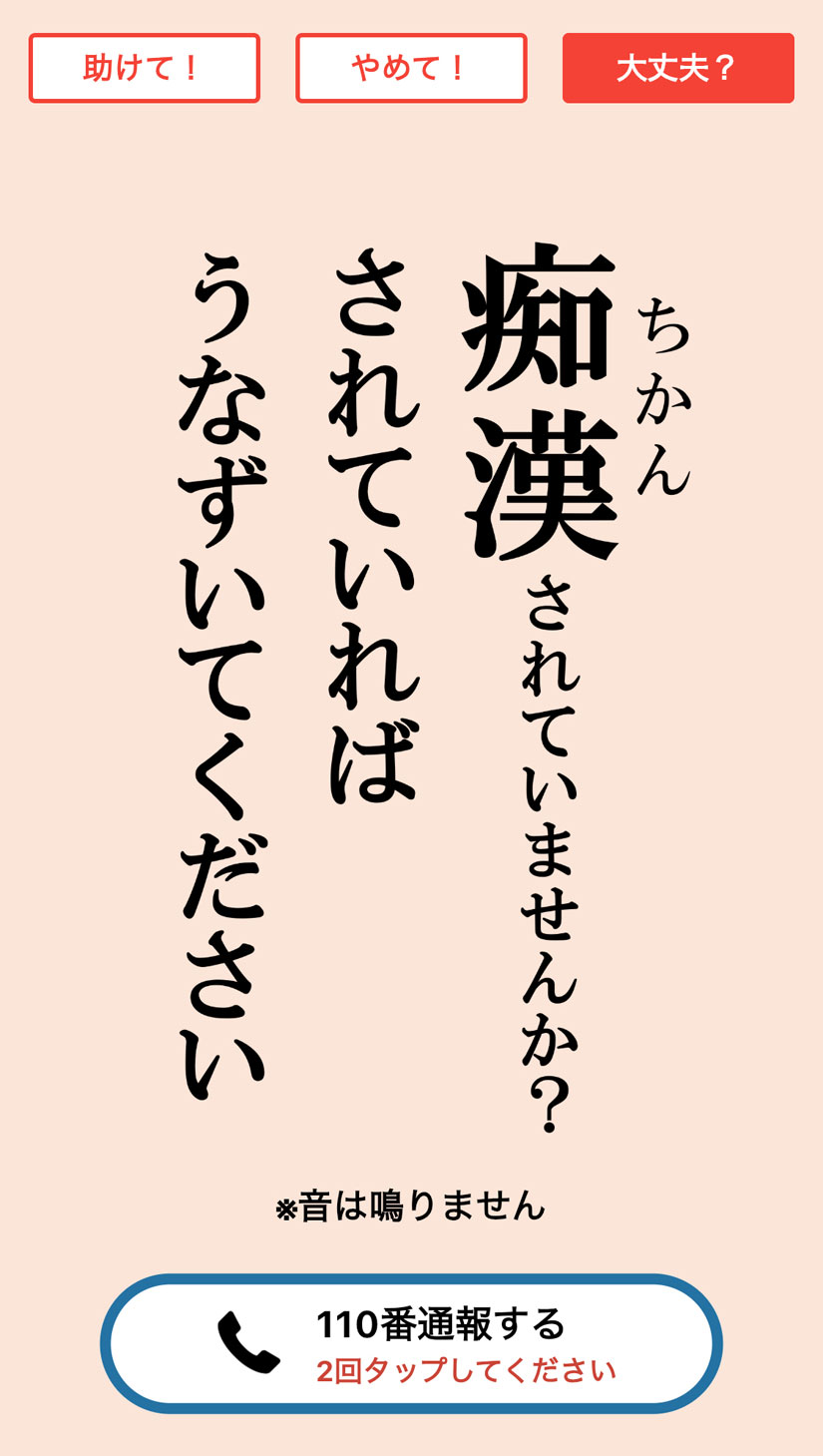 画面には「痴漢されていますか?」という問いかけが大きく表示され、うなずくだけで意思表示が可能。「助けて!」「やめて!」「大丈夫?」といったボタンも用意されており、状況に応じた行動を選べます。110番通報ボタンも設置されているため、すぐに警察へ連絡できる点も安心です。