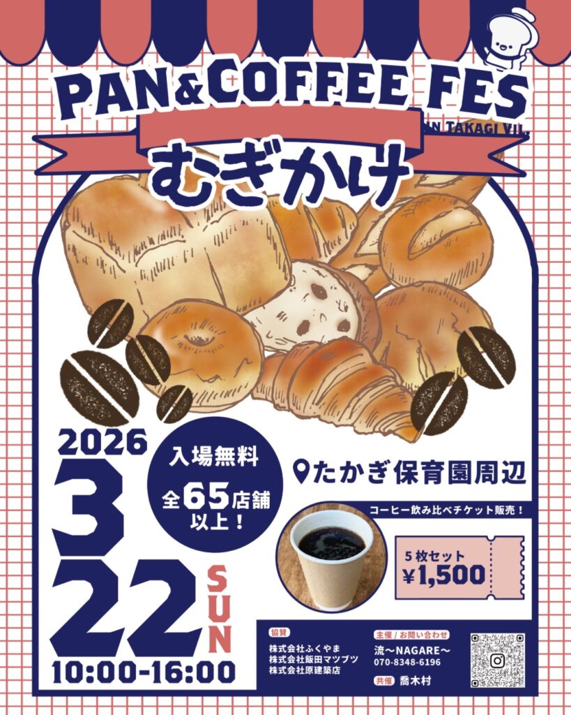 「パン×コーヒー」の大型イベントが喬木村で開催されます。人気ベーカリー、こだわりのコーヒー店、フード&スイーツ、合わせて65店以上が参加! コーヒーの飲み比べチケット(1500円)も販売します。パン好き、コーヒー好きの方は注目ですね。