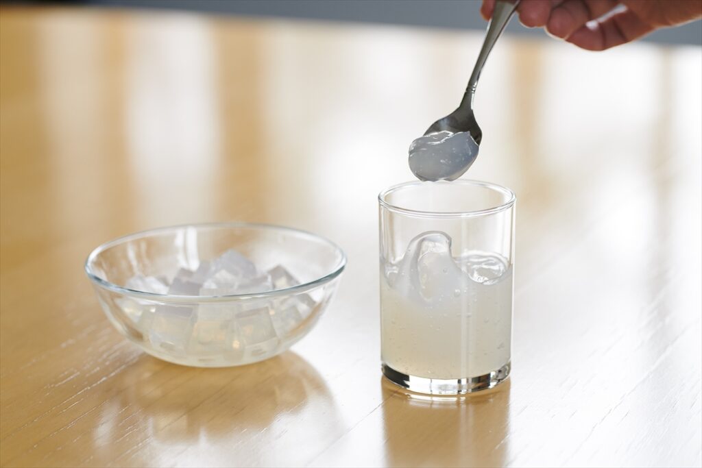 さらに、飲みごたえを出すために特殊な寒天(下の写真)を加え、とろみをプラス。「寒天自体には味がないので、素材の味を邪魔せず引き立てられるのが強みです。お子さまでも飲みやすいよう、カゴメさんとそれぞれの強みを生かしながら、試行錯誤して共同開発した商品です」と伊藤さん。慌ただしい朝でも手軽に取り入れられるので、朝食に栄養をプラスする習慣としてもおすすめです。