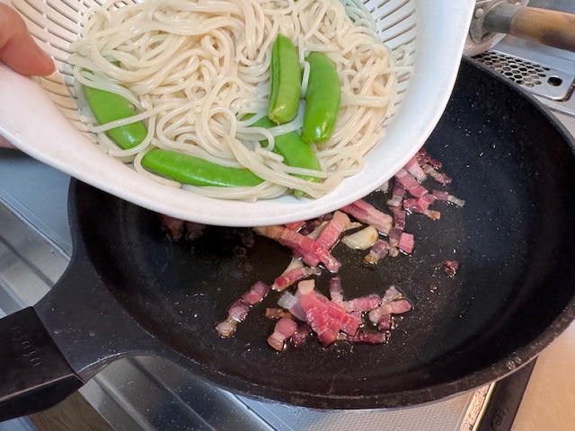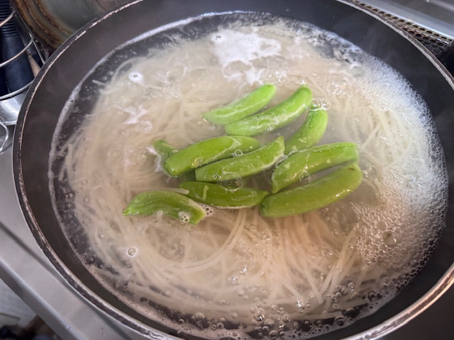 ①分量の塩を入れて、スパゲッティをゆではじめ、ゆで終わり3分前になったら、筋を取ったスナップエンドウを入れて、スパゲッティと一緒にゆでる