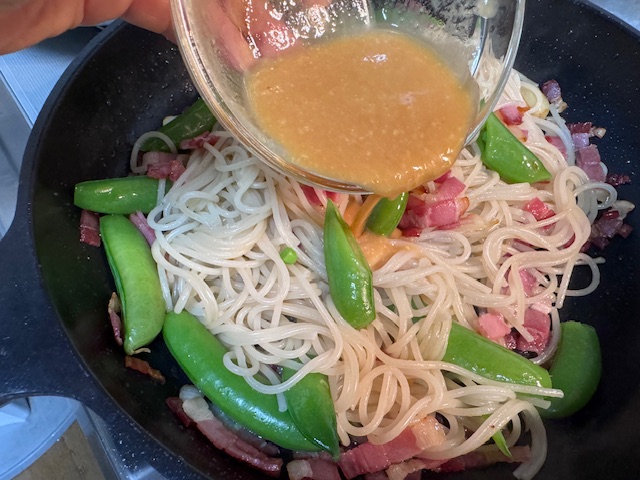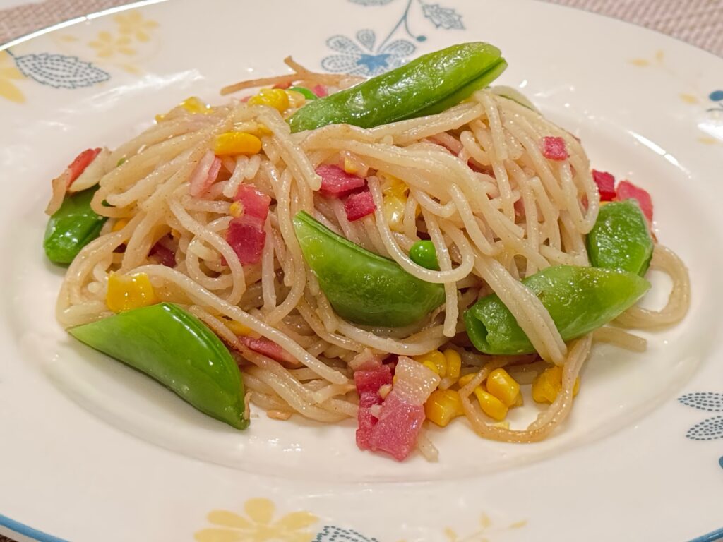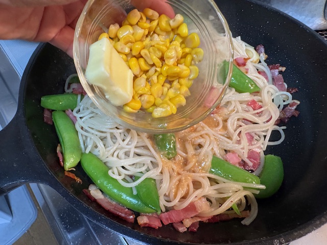 ④ ③に①のスパゲッティとスナップエンドウを入れて全体をまぜ合わせ、さらに②を加え、コーンとバターも入れて、全体をまぜ合わせる