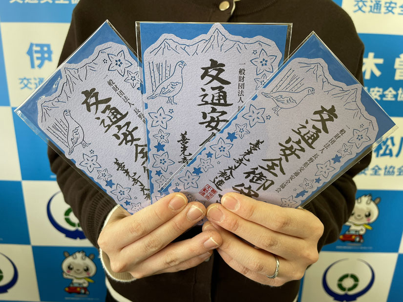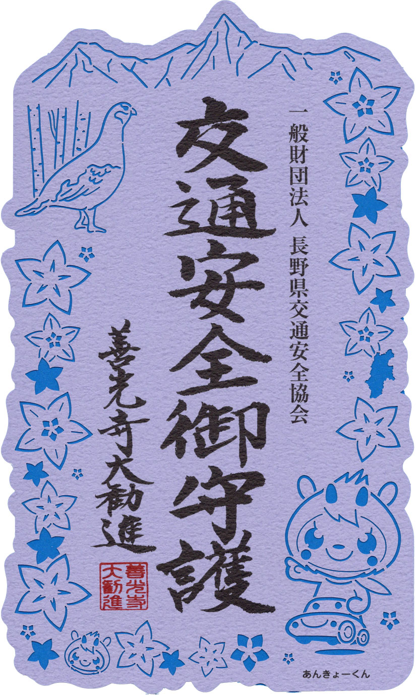 御守りは、善光寺大勧進の栢木貫主に筆をふるっていただき、護摩の御祈祷を受けたもの。「交通安全御守護」の文字と「一般財団法人 長野県交通安全協会」「善光寺大勧進」の銘が入った、長野らしい一品です。さらに、交通安全協会でしか手に入らない非売品で、ここでしか受け取れない特別な御守りとなっています。なかでも、切り絵の御守りは全国の交通安全協会でも初の取り組み。かわいいマスコットキャラクター「あんきょーくん」の絵柄入りで、見た目にも親しみやすいデザインです。