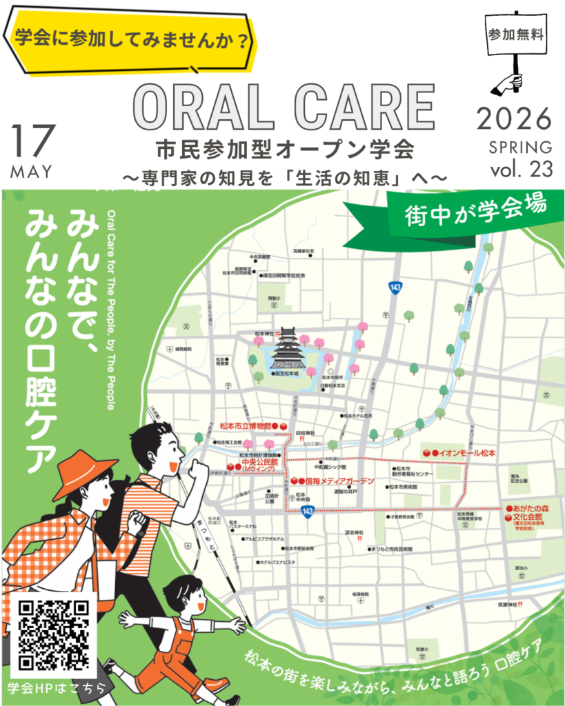「学会」と聞くと、ちょっと難しそうですよね。でも、いつもの街で、買い物のついでに、家族と一緒に、“気軽に参加できる”としたら、どうでしょう? 2026年5月、松本市でそんな体験ができる「第23回日本口腔ケア学会総会・学術大会」が開催されます。気になる“口腔ケア”が、ぐっと身近になるプログラム。「誰でも参加できる学会」に出かけてみましょう!